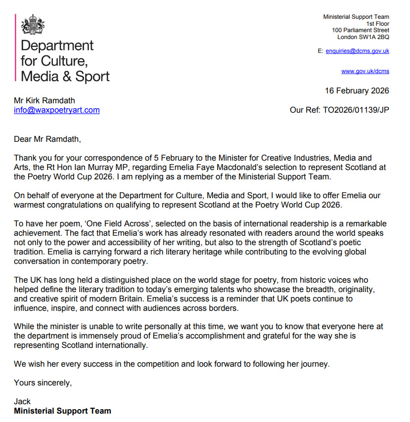 Wax Poetry and Art is grateful to receive a supporting letter on behalf of Scotland's Poetry World Cup Finalist, Emelia Faye Macdonald,